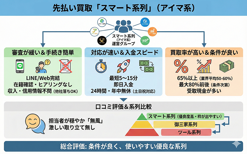 スマート系列の大きな特徴は、審査が比較的緩く、対応が速いこと、そして買取率が高めに設定されている点です。