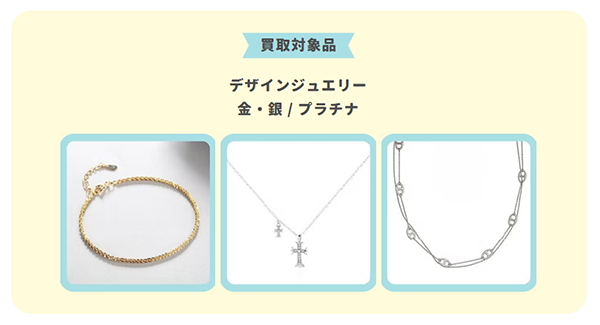 買取ジュエルの先払い買取サービスの取扱商品はデザインジュエリー・金・銀・プラチナになります。